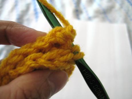 1. Insert hook from back to front thru the space between the dc stitches